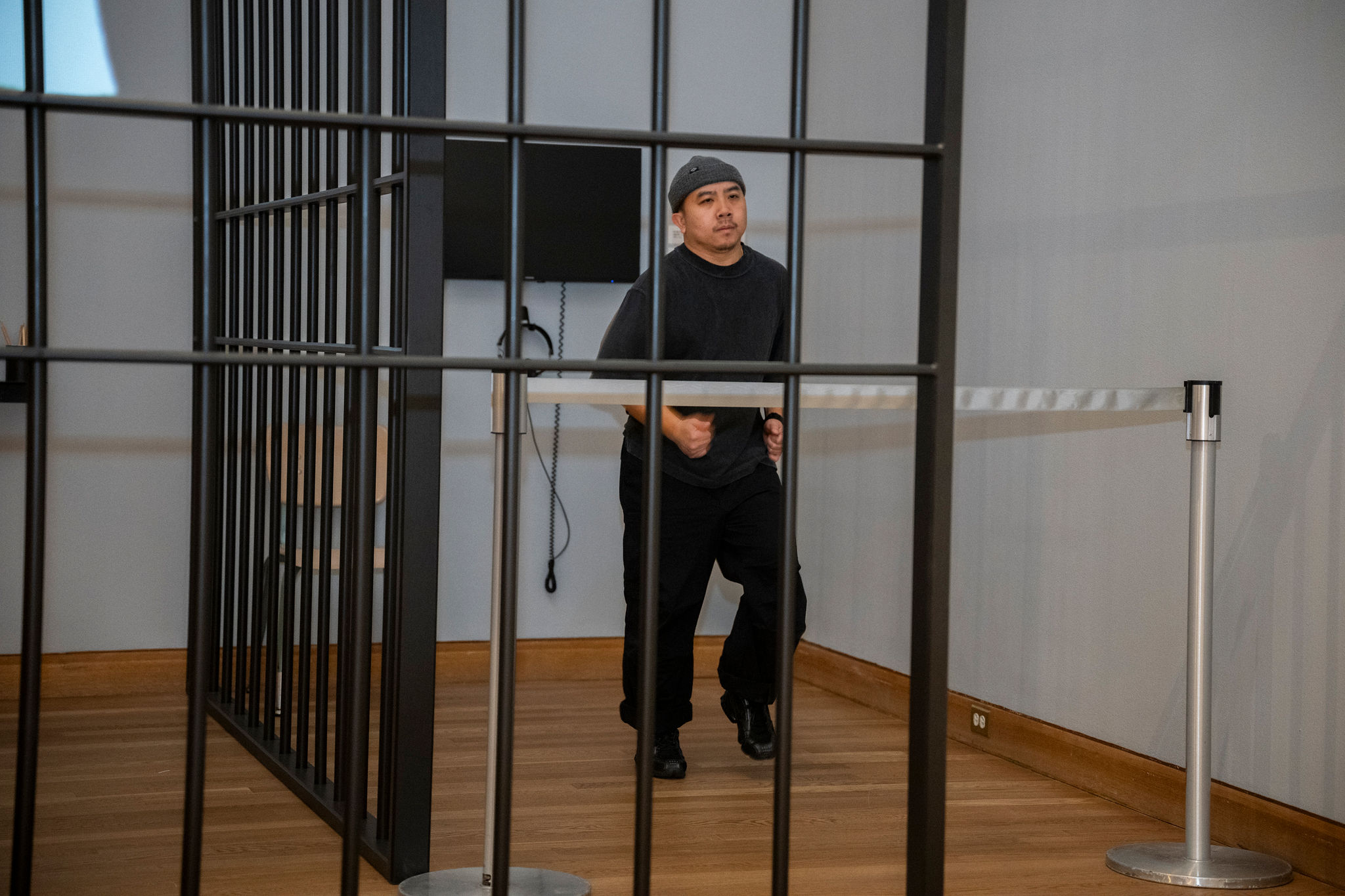 Much of memoirist, poet, and mental health advocate Sarith Peou’s life has been marked by a lack of bodily agency, including surviving the Cambodian genocide perpetrated by the Khmer Rouge in the late 1970s, displacement from labor camps to refugee camp, and his current incarceration. Sarith partnered with choreographer Carl Flink to restore greater agency to Sarith’s long and difficult journey. The “bars” and walls of this “cell” are covered with Sarith’s writing, which also float above the barriers like leaves. Within the “cell” lies the option to watch cage(d), a short film Sarith and Carl created together that includes a short film postscript with Black Label Movement performer Cheng Xiong executing Sarith’s exercise routine in the “cell’s” confining area. Sarith and Carl metaphorically place the viewer in Sarith’s shoes, emphasizing his persistent resilience in the face of continued isolation. As you move through the “cell,” is the opportunity to read selected writings by Sarith before they become leaves and fly away.